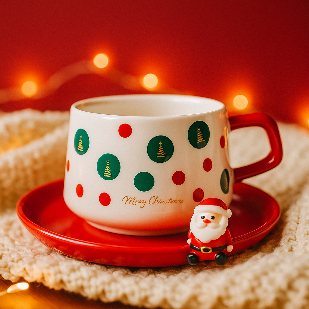 Incluye su propio platito rojo brillante y una cucharita metálica con detalle decorativo de Santa.
