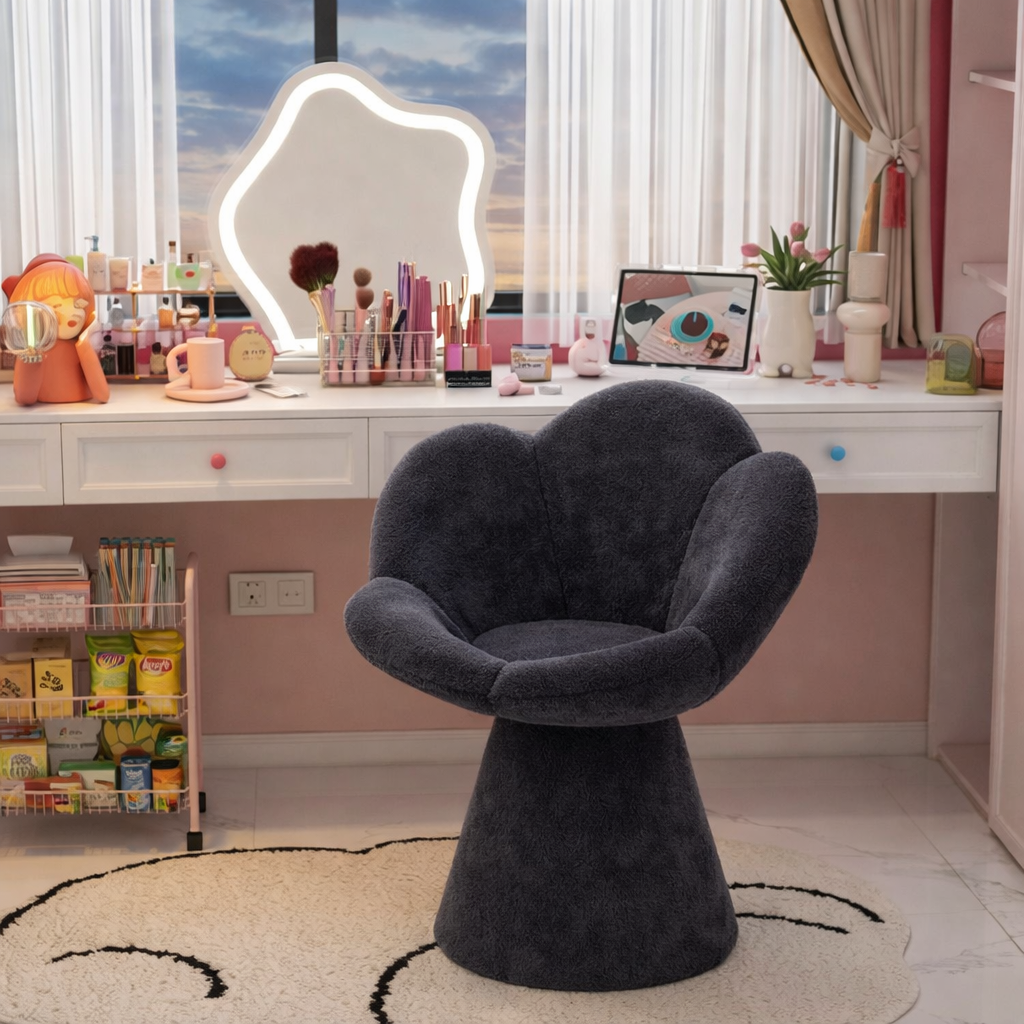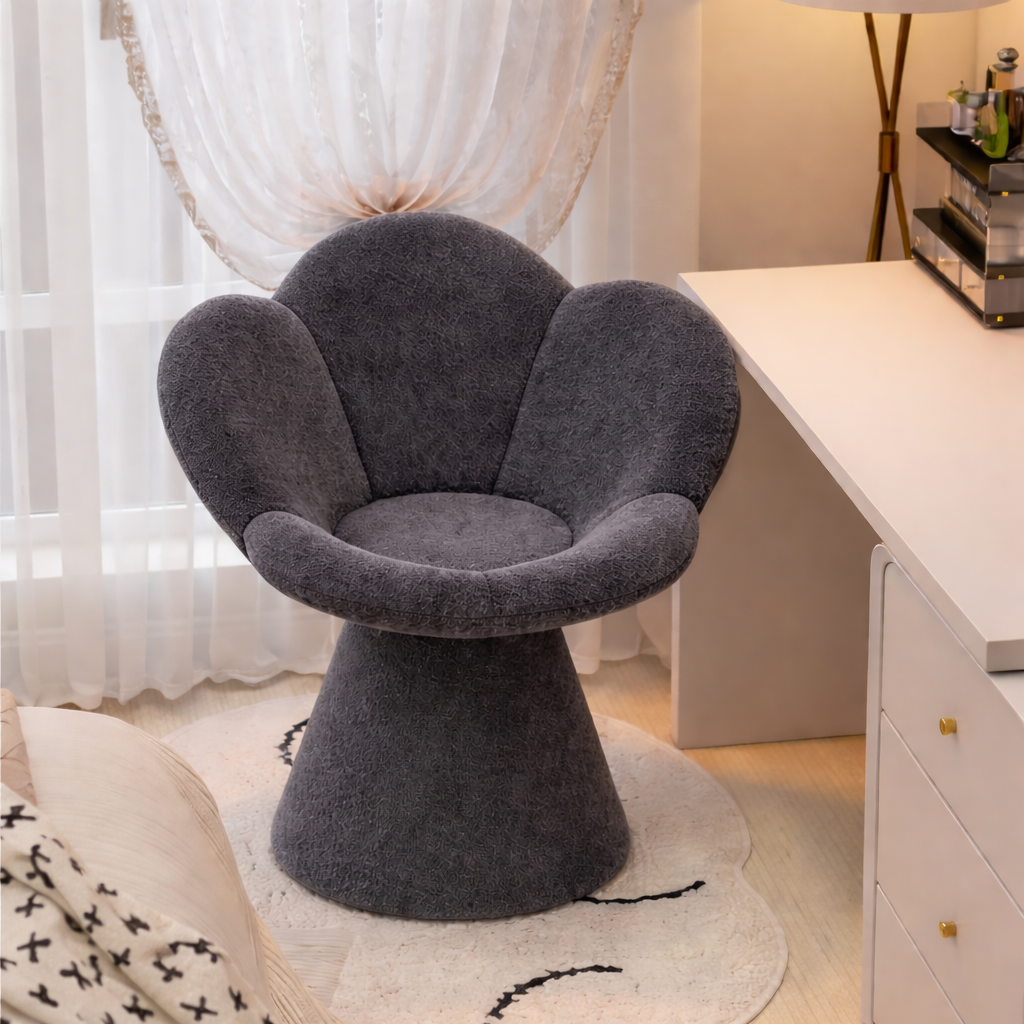 La silla giratoria tapizada 360° combina diseño moderno con funcionalidad, convirtiéndose en la pieza ideal para espacios de maquillaje, estudio o trabajo en casa. Su estructura compacta permite integrarla fácilmente en habitaciones, tocadores o escritorios sin ocupar demasiado espacio, mientras aporta un toque elegante al ambiente.