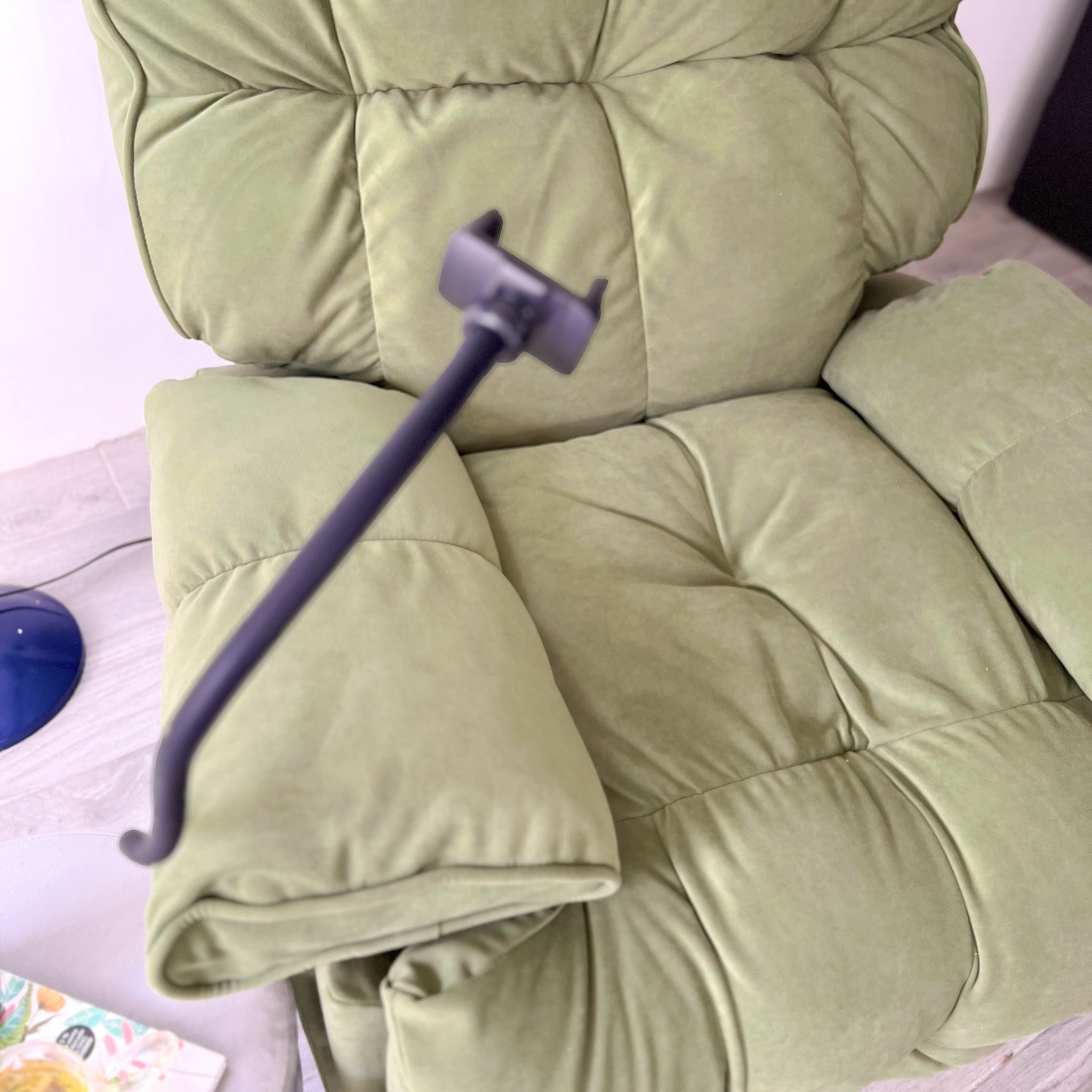 Cuenta con un sistema de reclinación fácil de usar que permite ajustar la posición del respaldo para mayor comodidad. Además, incluye un práctico soporte flexible para celular que facilita ver contenido, leer o realizar videollamadas sin necesidad de sostener el dispositivo, convirtiéndolo en una opción ideal para espacios de descanso, lectura o entretenimiento.