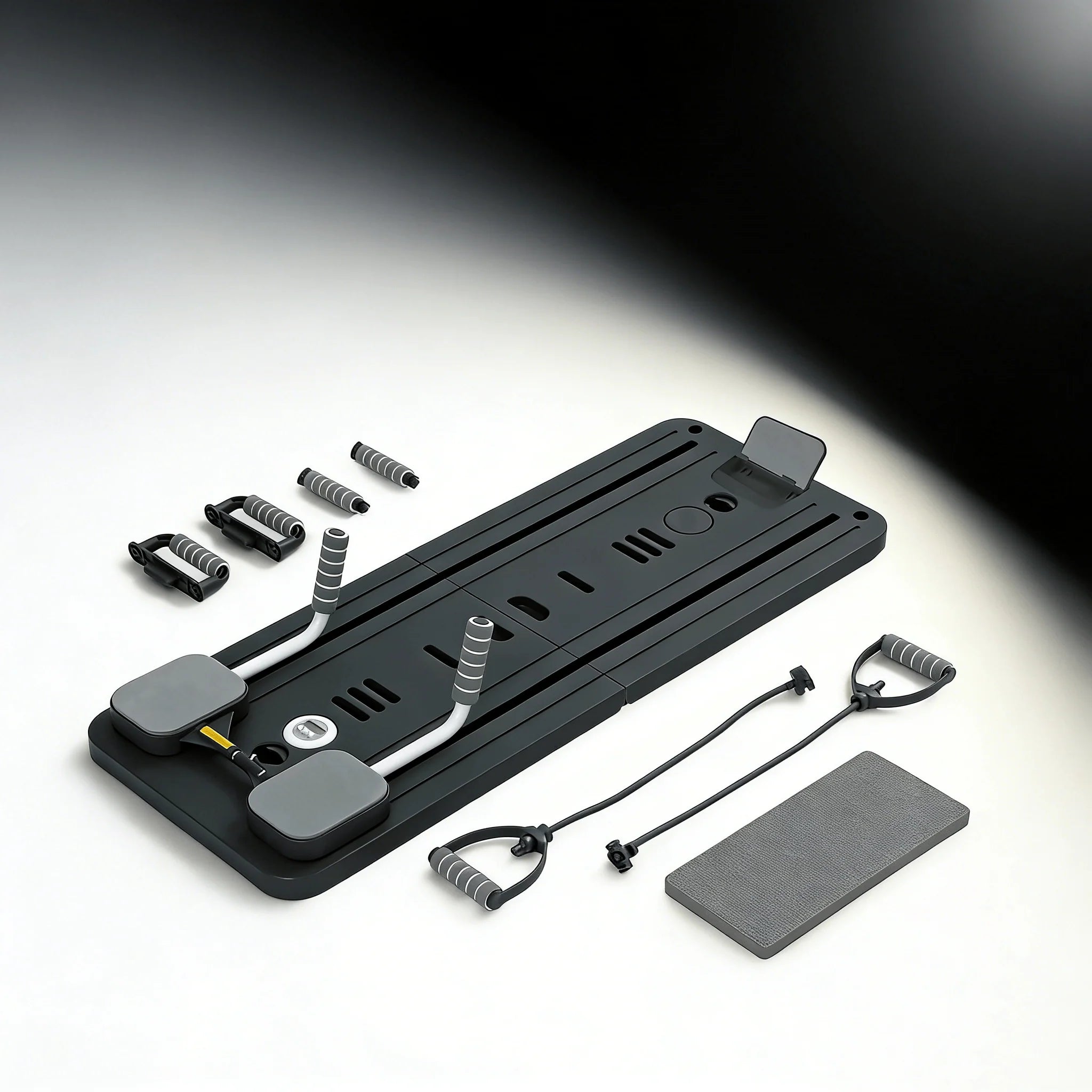 Incluye bandas de resistencia, soporte para flexiones y almohadilla para rodillas que ayudan a realizar rutinas más cómodas y seguras. Además, cuenta con un temporizador digital integrado para controlar el tiempo de cada ejercicio, permitiendo mantener un ritmo constante durante tus sesiones de pilates o entrenamiento.