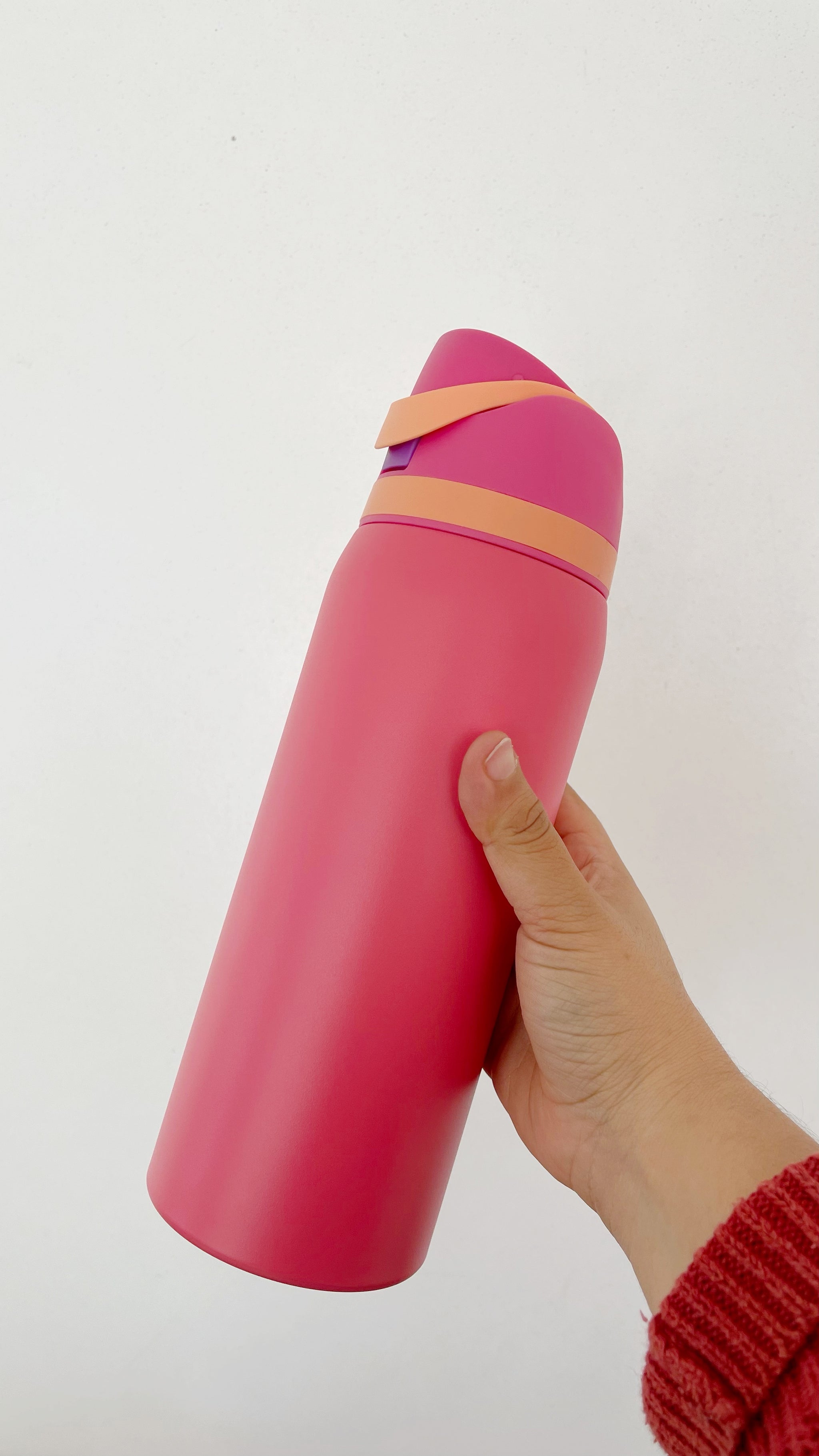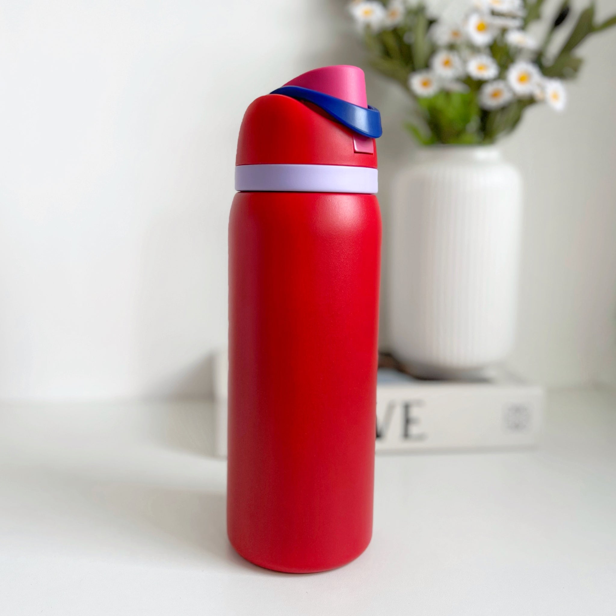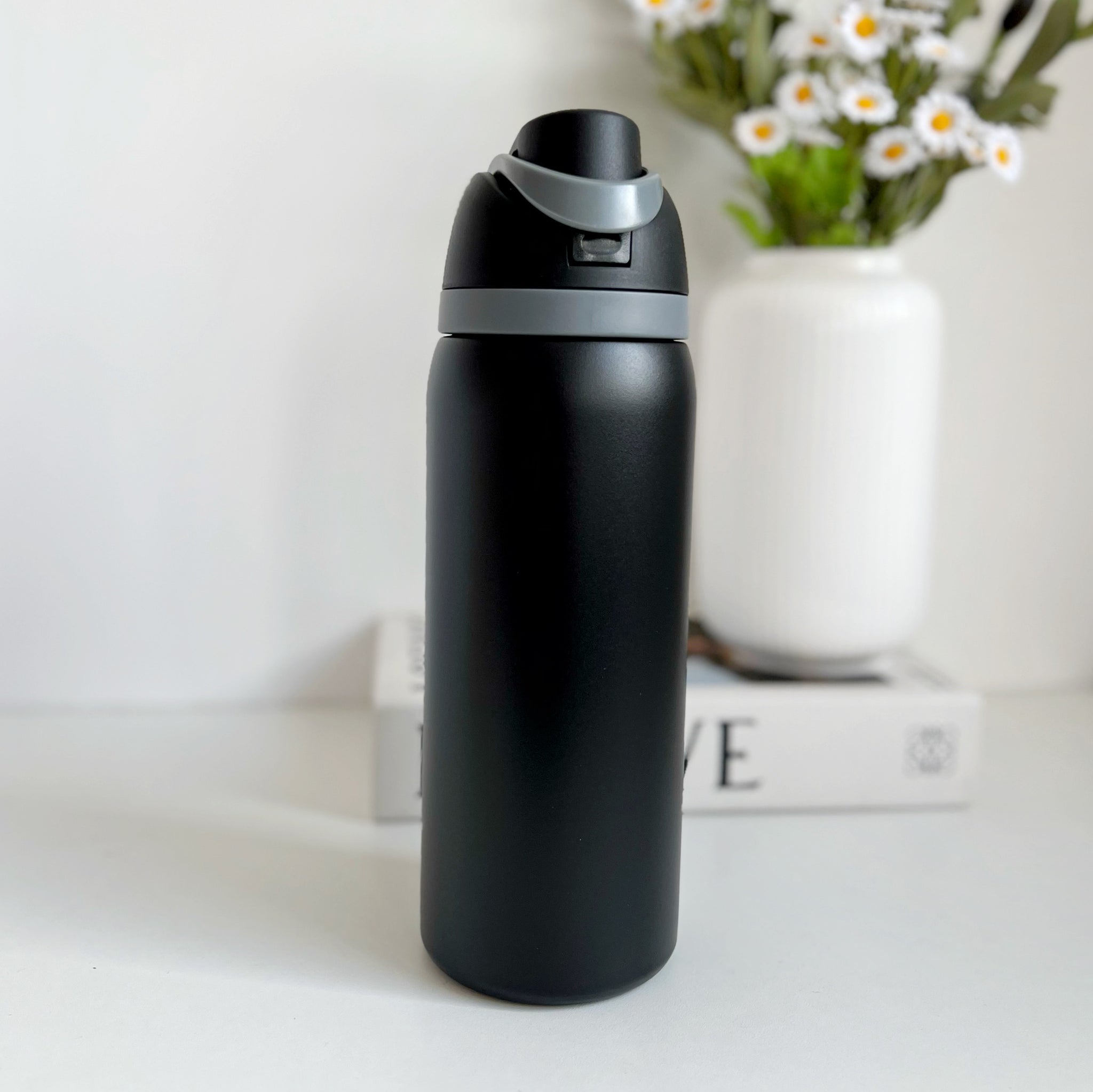 Botella de agua aislada de acero inoxidable de 32oz/1000ml con boquilla FreeSip y tapa de botón con cerradura diseñada para beber en posición vertical a través de la pajita integrada o inclinarse hacia atrás para tragar desde la abertura de la boquilla. El aislamiento de doble pared mantiene las bebidas frías hasta 24 horas; amplia apertura para limpiar y añadir hielo, Libre de BPA ni ftalatos; taza de lavado a mano, tapa apta para lavavajillas; no para uso con líquidos calientes