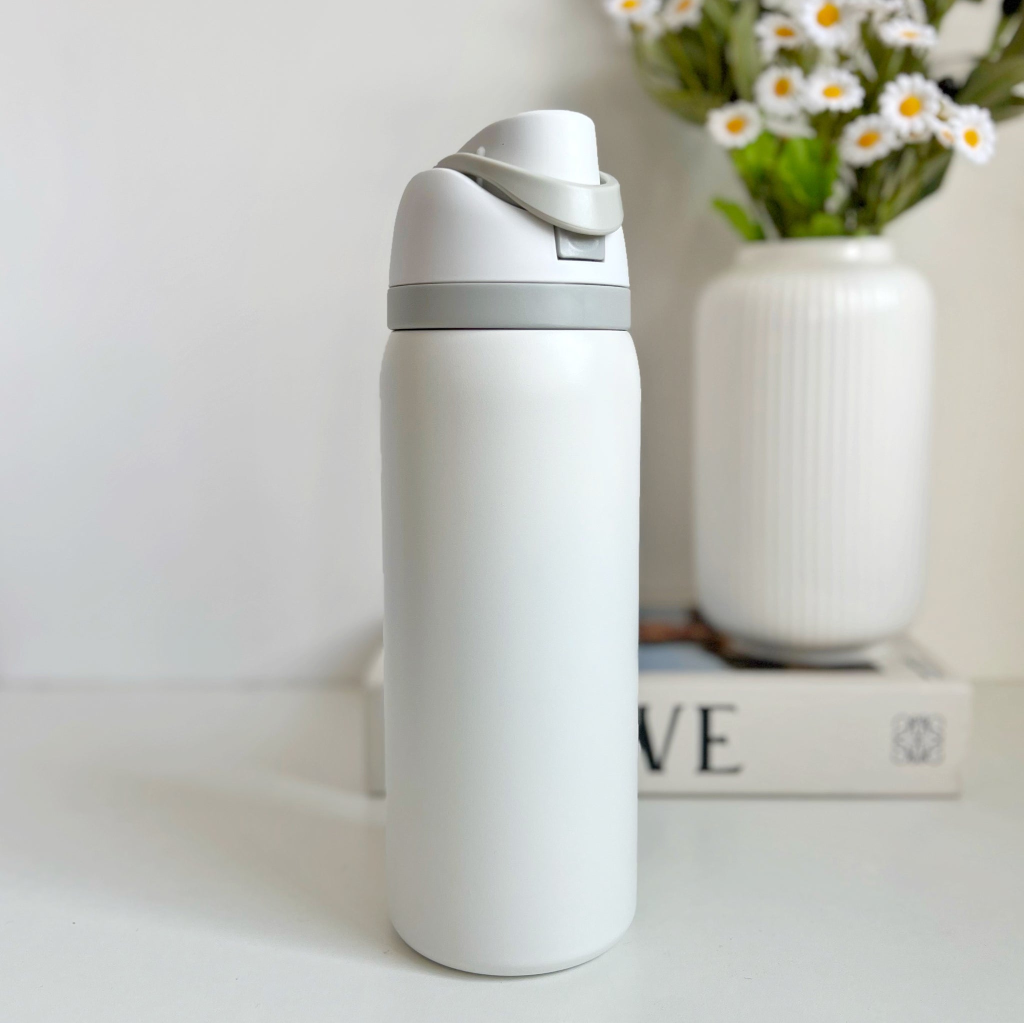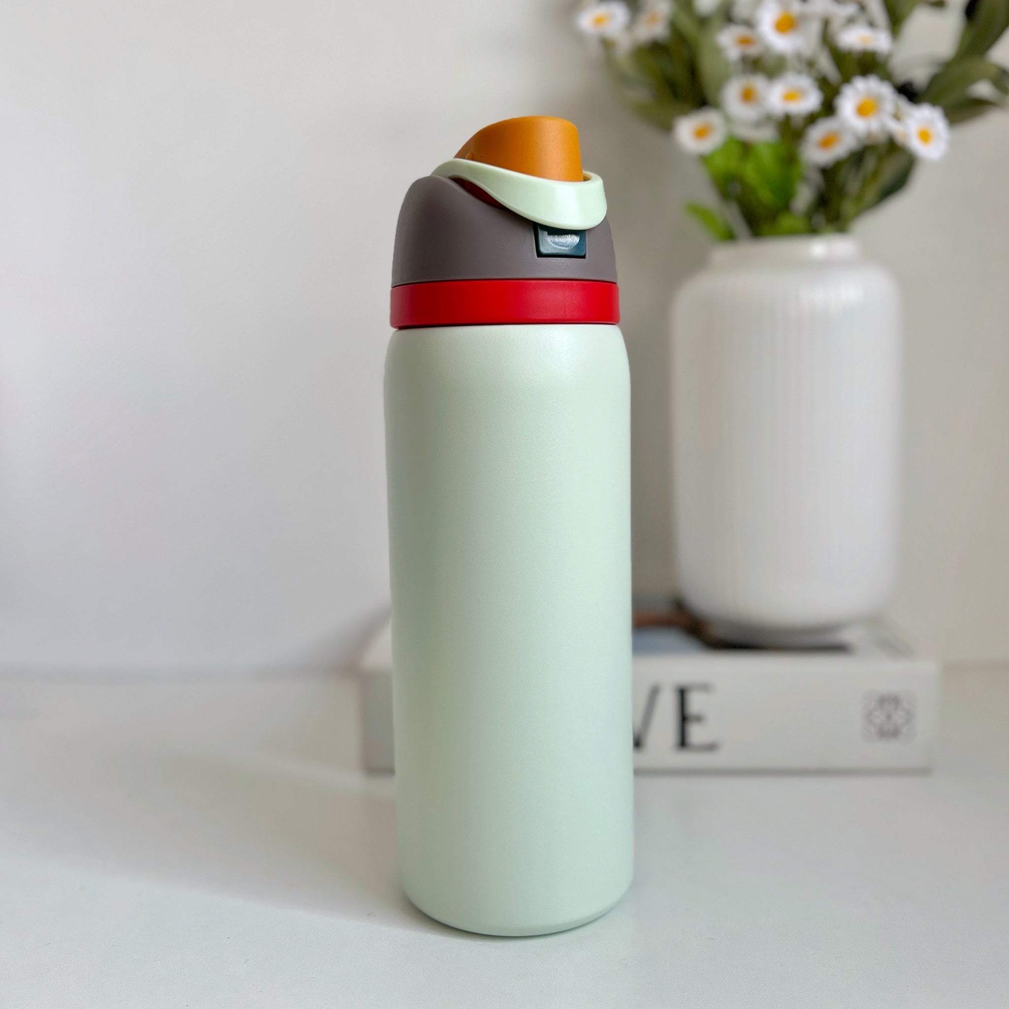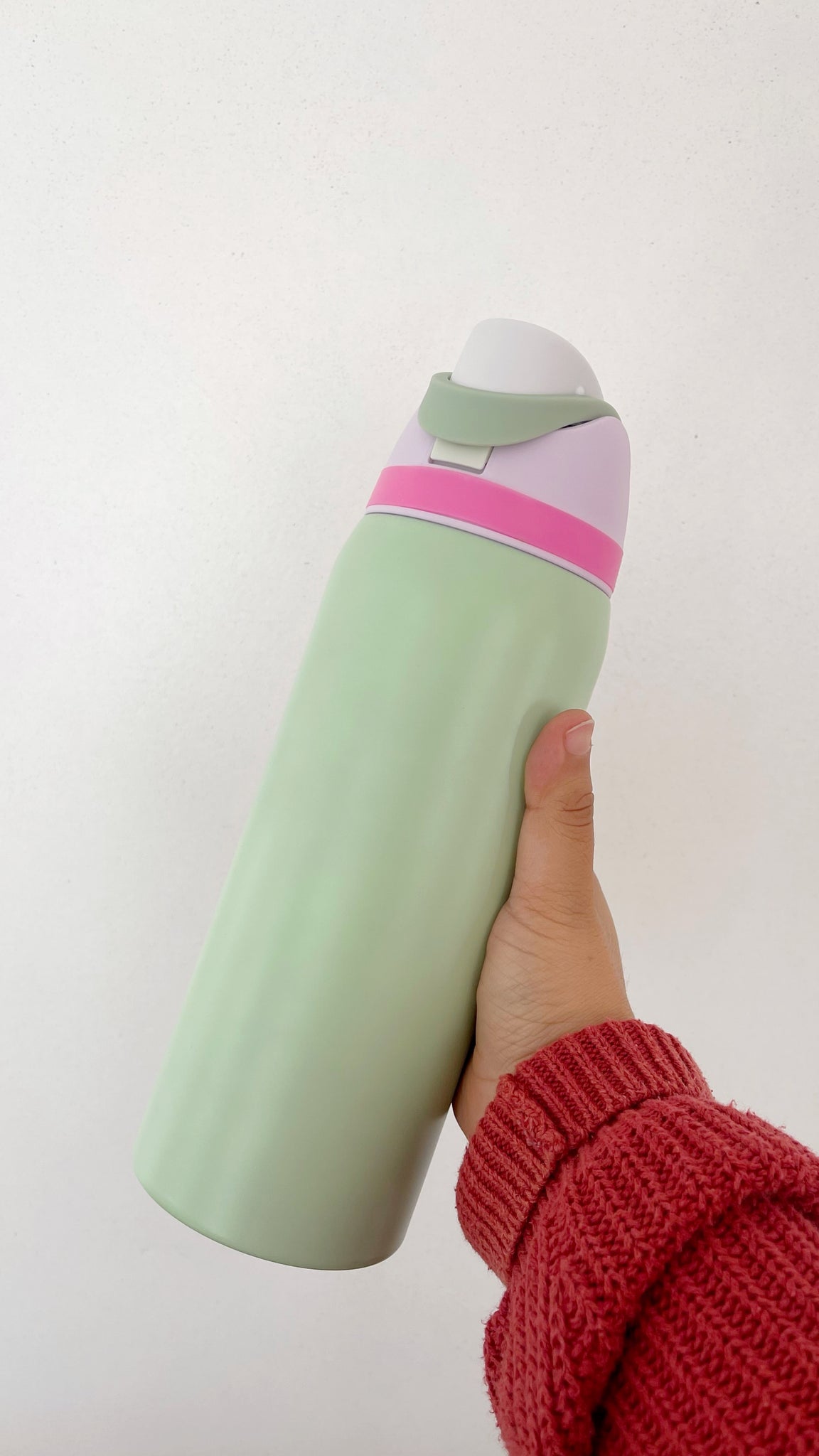 Botella de agua aislada de acero inoxidable de 32oz/1000ml con boquilla FreeSip y tapa de botón con cerradura diseñada para beber en posición vertical a través de la pajita integrada o inclinarse hacia atrás para tragar desde la abertura de la boquilla. El aislamiento de doble pared mantiene las bebidas frías hasta 24 horas; amplia apertura para limpiar y añadir hielo, Libre de BPA ni ftalatos; taza de lavado a mano, tapa apta para lavavajillas; no para uso con líquidos calientes