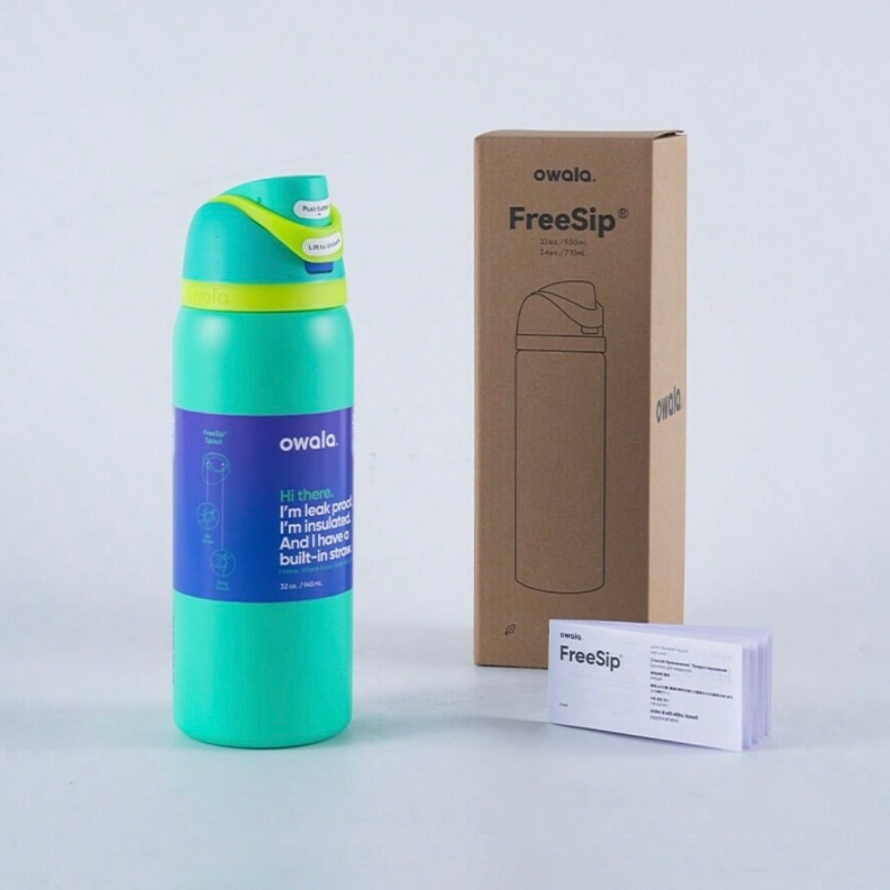 Botella de agua aislada de acero inoxidable de 32oz/945ml con boquilla FreeSip y tapa de botón con cerradura diseñada para beber en posición vertical a través de la pajita integrada o inclinarse hacia atrás para tragar desde la abertura de la boquilla. El aislamiento de doble pared mantiene las bebidas frías hasta 24 horas; amplia apertura para limpiar y añadir hielo, Libre de BPA ni ftalatos; taza de lavado a mano, tapa apta para lavavajillas; no para uso con líquidos calientes
