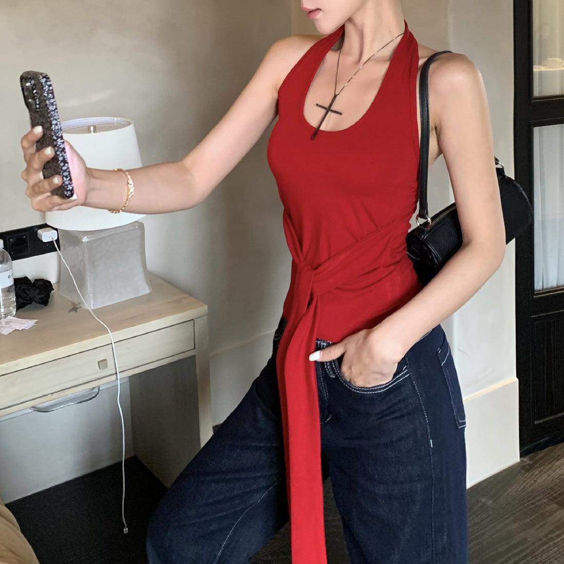 Top halter con escote y lazo