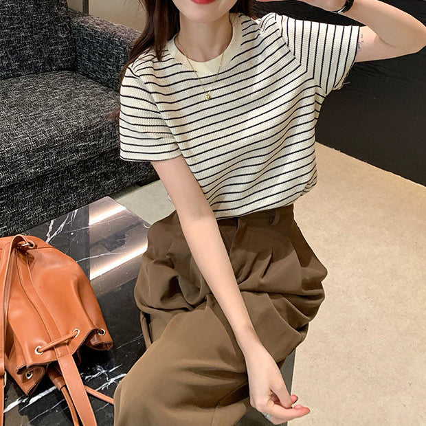 Esta blusa rayada en tono beige con líneas negras combina el estilo clásico parisino con un aire moderno y minimalista. Su diseño limpio y atemporal la convierte en esa prenda que puedes usar para oficina, universidad o una salida casual, siempre logrando un look pulido sin esfuerzo.