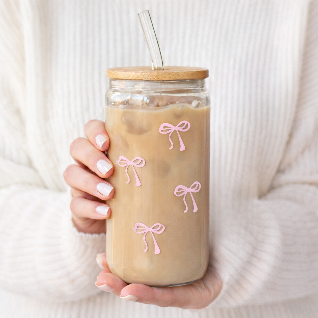 Este vaso de vidrio es el complemento perfecto para tus bebidas favoritas, combinando funcionalidad con un diseño aesthetic y delicado. Su acabado transparente con detalles de moñitos en tono rosa lo convierte en una pieza ideal para café frío, matcha, iced latte, jugos o bebidas refrescantes, elevando cualquier momento del día con un toque cute y moderno.