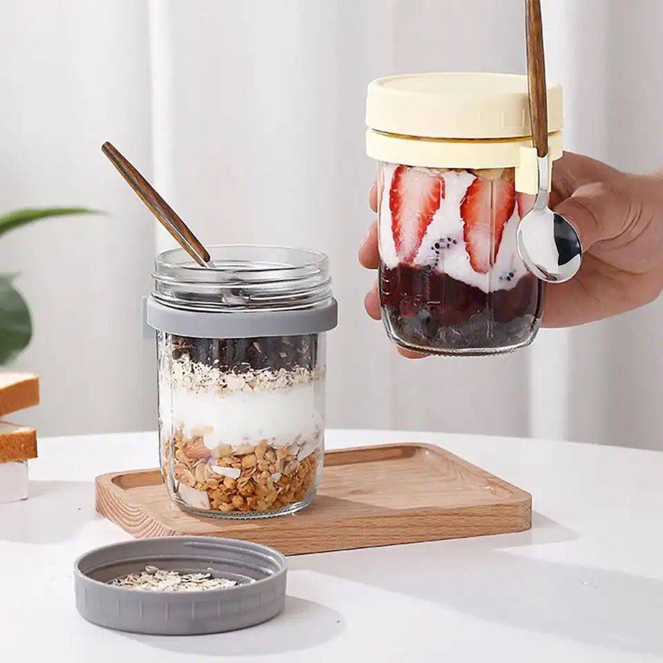 El frasco de vidrio con cuchara integrada es ideal para almacenar avena, yogurt, frutas, snacks o ingredientes secos de manera práctica y organizada. Su diseño incluye marcas de medición en mililitros que facilitan el control de porciones y preparación de recetas.