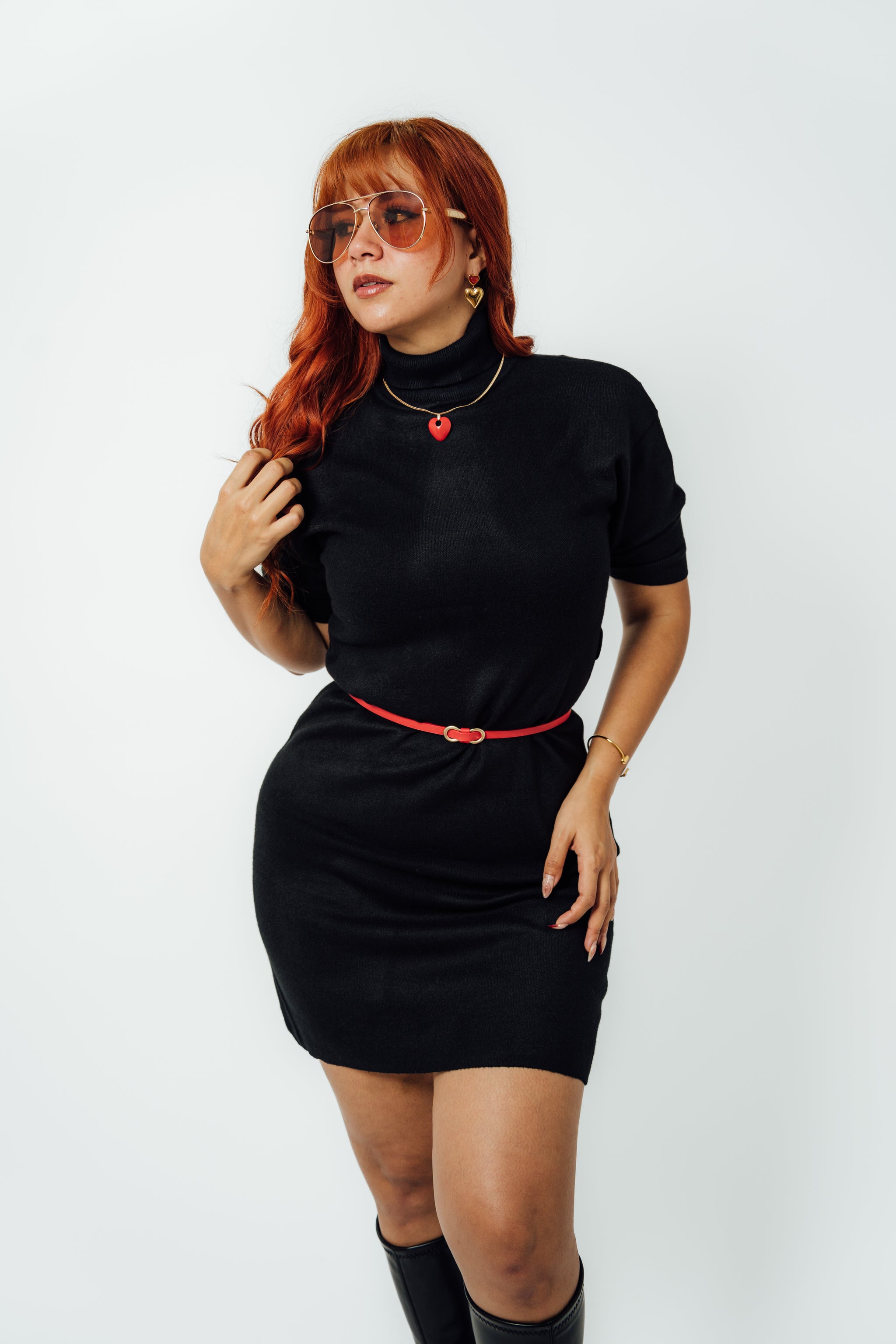 Minimalismo con elegancia. Este vestido de manga corta y cuello alto es la definición de sofisticación casual. Su cinturón a juego realza la silueta, lo convierten en un look perfecto para el día o la noche.