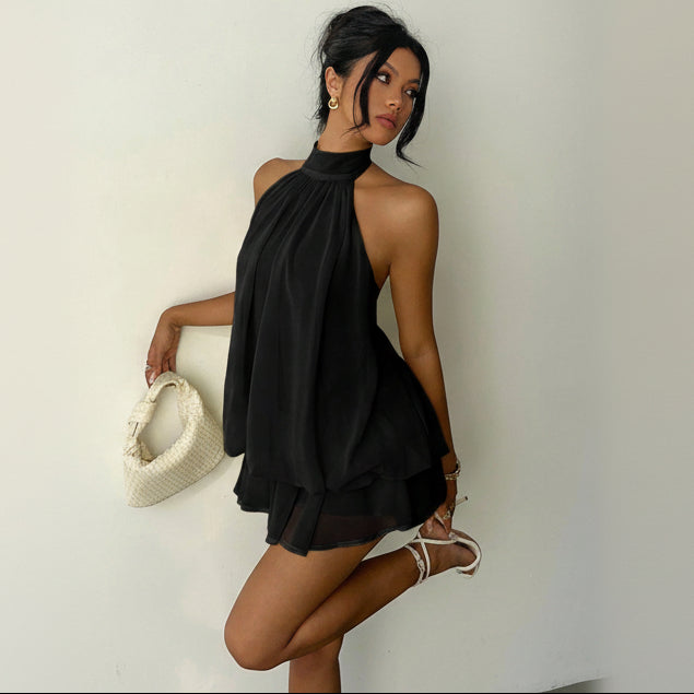 Vestido corto con cuello halter y caída fluida, confeccionado en tela ligera que aporta movimiento y elegancia. Su diseño de capas y escote recogido realza la silueta con un toque delicado y femenino. Ideal para ocasiones especiales o para un look sofisticado de día.
